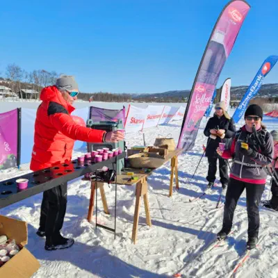De var litt utålmodige, så de rigget en drikkestasjon ute i langrennsløypa på Geilo. Veldig hyggelig
